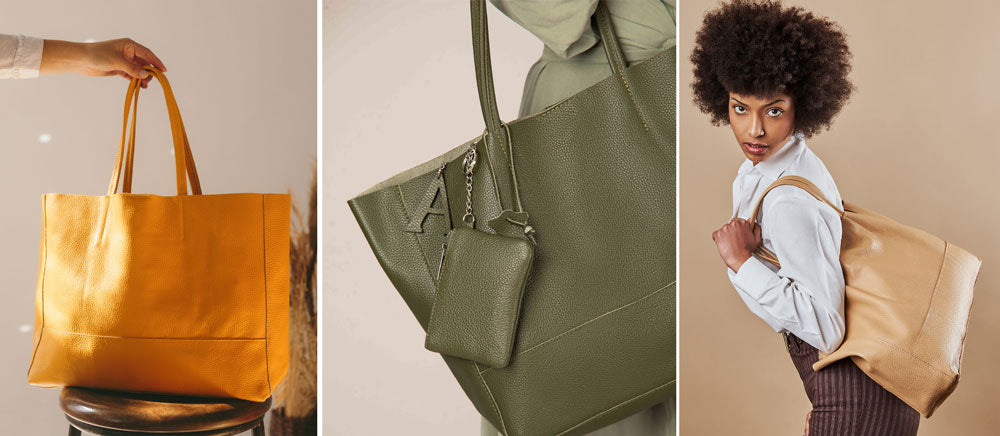 I received my totes in Canary Yellow and Ivory. The leather is beautiful and I love the soft, slouchy style. From the pictures I thought the Ivory was a much lighter color. It’s actually much darker than pictured. If I had known the true color I would have selected a different color.